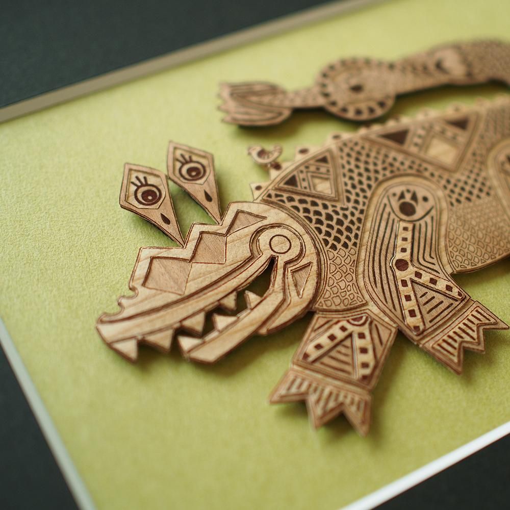 ちょっと不思議な森の中、冒険に出かけてみませんか?素敵な出会いがありそうです。土台のみ紙ですが、あとは全部木を貼り重ねてつくります。