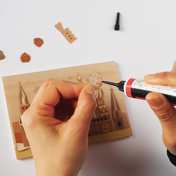 ペーパークラフト感覚で、カッターとボンドさえあれば気軽にできるハンドメイドの木工アートです。