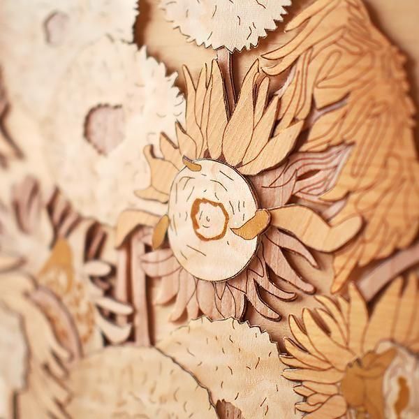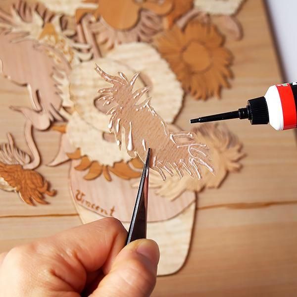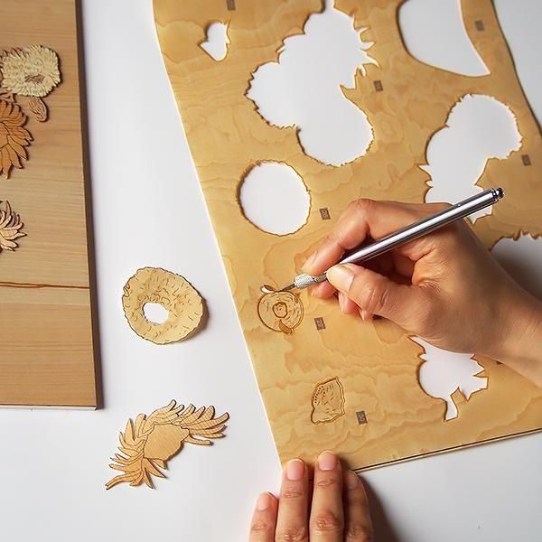 ペーパークラフト感覚で、カッターとボンドさえあれば気軽にできるハンドメイドの木工アートです。